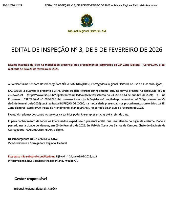 Segundo o Edital a Inspeção ocorre no período de 24 a 26 de fevereiro de 2026, ou seja, encerra hoje (26). A medida tem como objetivo verificar a regularidade dos procedimentos cartorários da 23ª Zona Eleitoral de Careiro/AM.