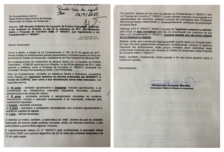 Conforme o governador Amazonino, a lei, sancionada em agosto pela Presidência da República, é a principal ameaça aos incentivos fiscais do Polo Industrial de Manaus (PIM) dos últimos anos. “Essa lei convalida os incentivos fiscais e financeiros concedidos pelos Estados por legislação estadual ou distrital publicados até 8/8/2017, à revelia do Confaz”, disse o governador na carta.