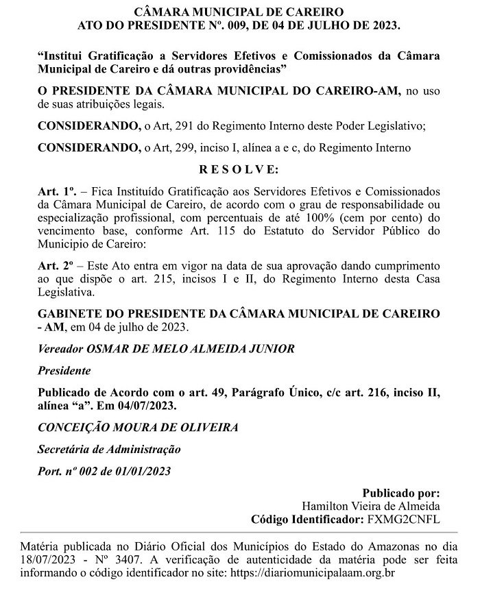 Careiro/AM – O presidente da Câmara Municipal do Careiro, vereador Osmar de Melo Almeida Junior, através Ato Nº 009/2023 publicado no Diário Oficial no dia 18/07/203 que instituiu gratificação aos servidores efetivos e comissionado da Câmara com percentuais de até 100% do valor do salário base, conforme artigo primeiro do ato a seguir: