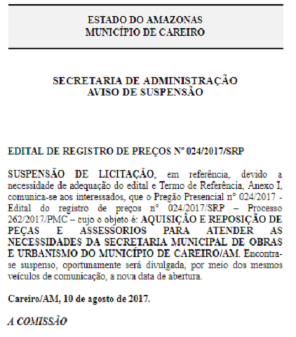 Careiro Castanho Aviso de Suspensão de Licitação 18 de agosto de 2017 Share FacebookTwitterPinterestWhatsApp Aviso de Suspensão de Licitação publicada no Diário Oficial dos Municípios Facebook: www.facebook.com/portaldocareiro/ Twitter: @PortaldoCareiro Redação: (92)99191-9814 Tagsdestaque Share FacebookTwitterPinterestWhatsApp Artigo anteriorGoverno amplia público-alvo de vacinas de HPV para adultos até 26 anosPróximo artigoPF deflagra operação para investigar fraudes no Bolsa Atleta LEIA MAIS Careiro Castanho Você Sabia? A Prefeitura Recebeu R$ 960 Mil para Reformar o Mercado Municipal 29 de setembro de 2025 Careiro Castanho Careiro/AM: Lei proíbe uso de fogos de artifício; multas variam de R$ 2 mil a R$ 5 mil 23 de setembro de 2025 Careiro Castanho Você sabia? Careiro recebeu mais de R$ 10 milhões extras de convênios este ano 22 de setembro de 2025