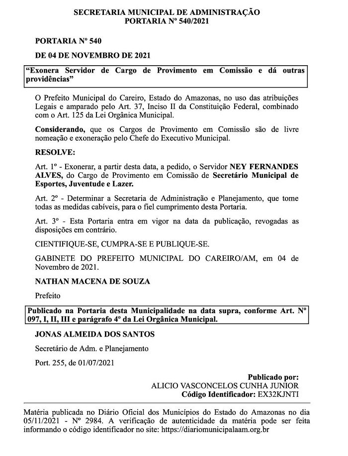 Publicação da exoneração de Ney Fernandes: Código Identificador: EX32KJNTI