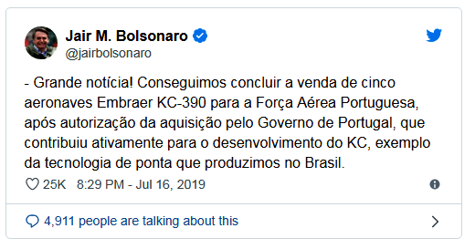 “Conseguimos concluir a venda de cinco aeronaves Embraer KC-390 para a Força Aérea Portuguesa, após autorização da aquisição pelo Governo de Portugal, que contribuiu ativamente para o desenvolvimento do KC, exemplo da tecnologia de ponta que produzimos no Brasil”, disse Bolsonaro em seu Twitter.