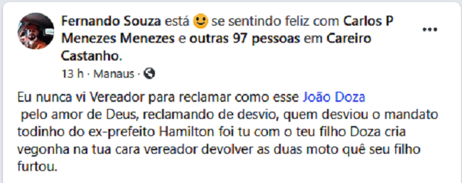 Vereador João Doza – Entramos em contato com o Vereador João Doza de Oliveira Neto para saber a sua posição sobre as denuncias, ele respondeu ao Portal do Careiro o seguinte: