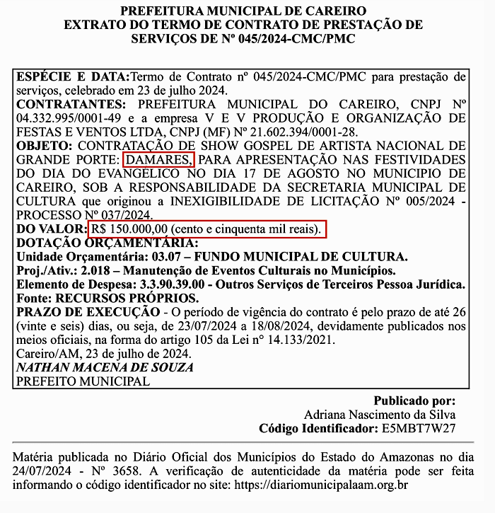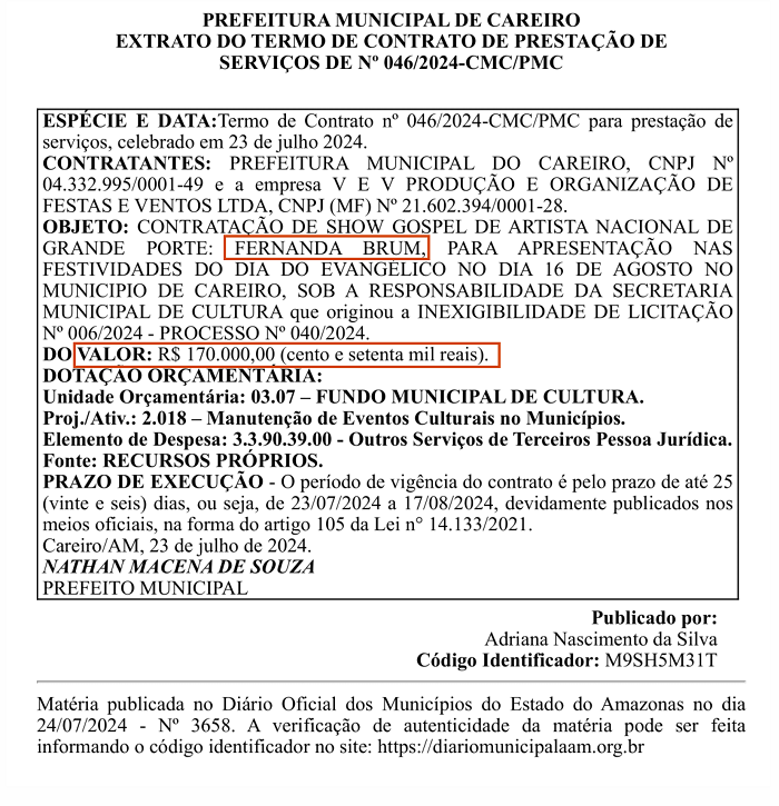 Careiro/AM – Em comemoração à 19ª Edição do Dia do Evangélico no município de Careiro, Amazonas, a Prefeitura Municipal, por meio do Fundo Municipal de Cultura, contratou duas atrações nacionais: as cantoras gospel Fernanda Brum e Damares. O custo total dos dois shows foi de R$ 320.000,00 (trezentos e vinte mil reais).