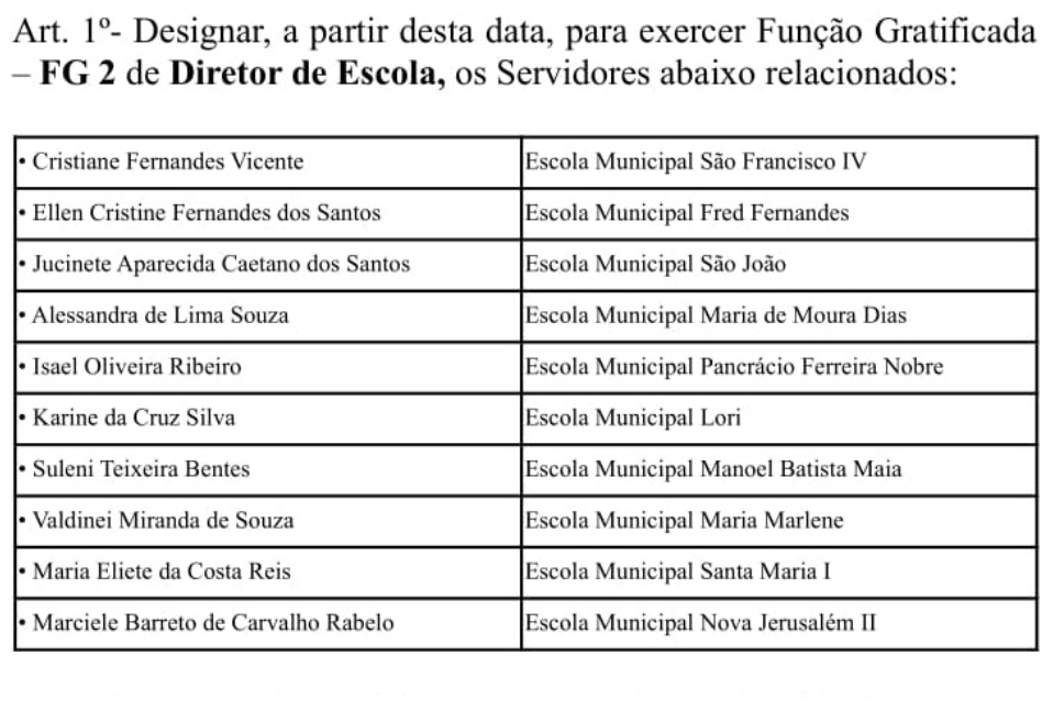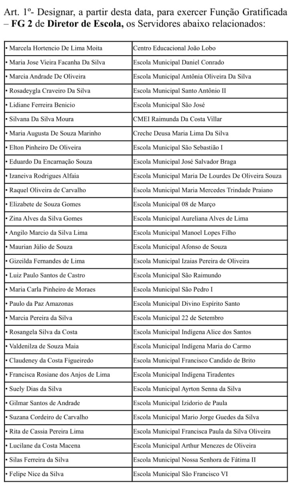 Careiro/AM – A prefeita Mara Alves do município do Careiro, no Amazonas, publicou as Portarias Nº 018/2026 e Nº 019/2026, por meio das quais designa servidores ocupantes de Função Gratificada (FG-2) para exercerem a função de diretores de escolas da rede municipal de ensino, conforme descrito a seguir.