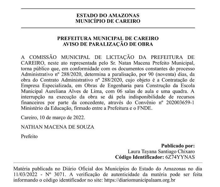 Fonte: Diário Oficial dos Municípios do Estado do Amazonas – Código Identificador: 6Z74YYNAS