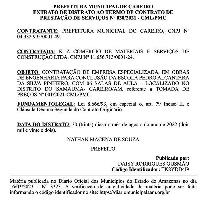Dia 16/03/2023 – Data da publicação do Distrato do Termo de Contrato de Prestação de Serviços Nº 030/2021, Código Identificador: TK8YDD4I9.