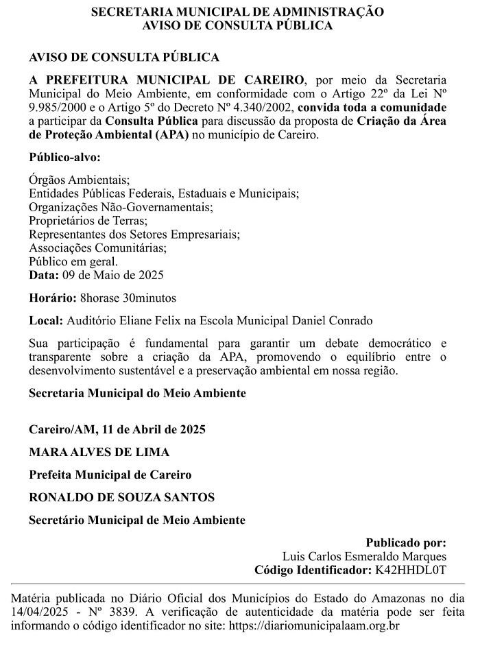 Careiro/AM – A Prefeitura do Careiro, no estado do Amazonas, publicou no Diário Oficial dos Municípios do Amazonas, na data de ontem (14/04), um Aviso de Consulta Pública. O documento convida toda a comunidade a participar da Consulta Pública destinada à discussão da proposta de criação de uma Área de Proteção Ambiental (APA) no município do Careiro, conforme a seguir:
