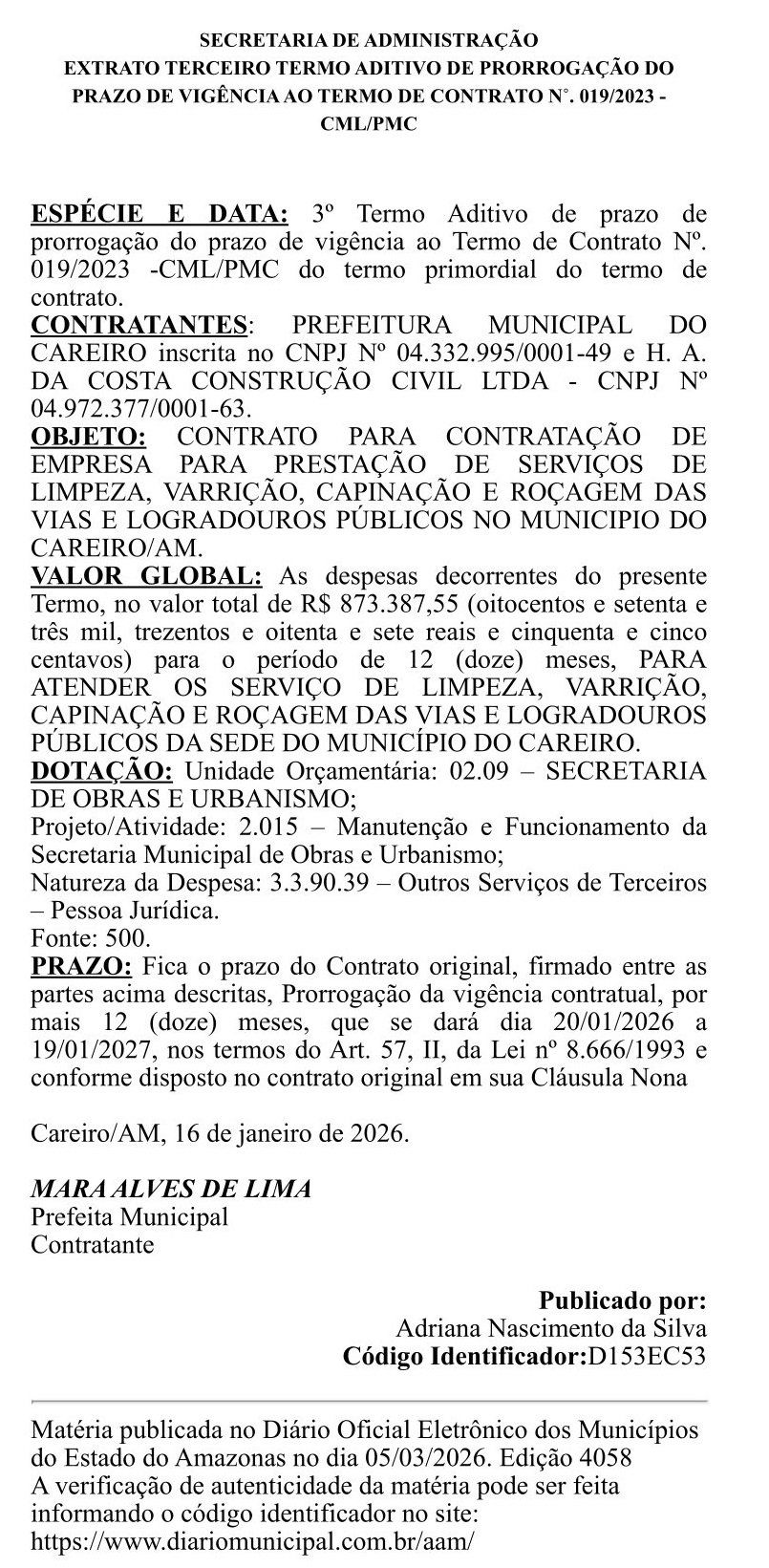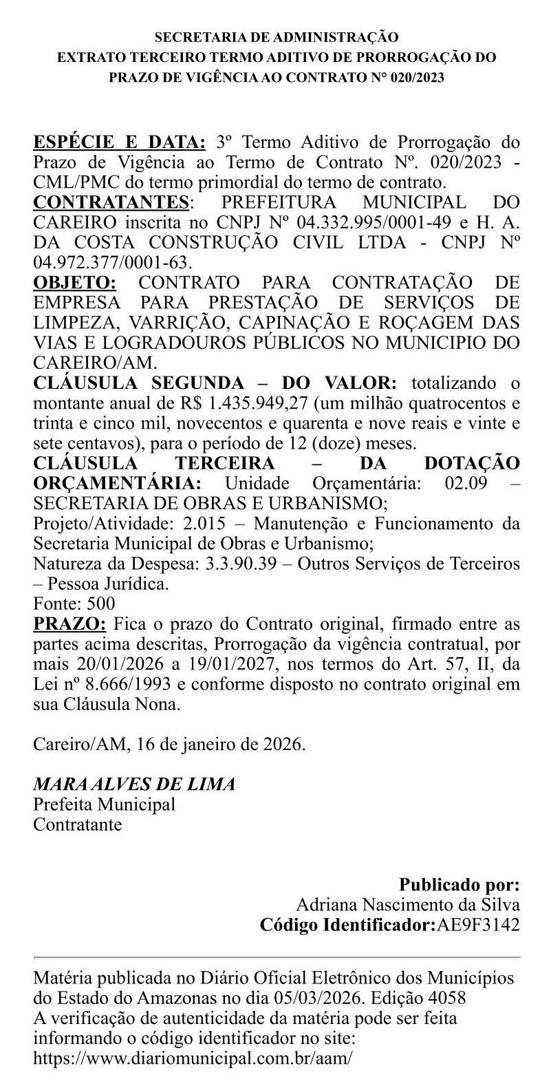 Careiro/AM – A Prefeitura do Careiro, no Amazonas, prorrogou por mais 12 meses dois contratos de limpeza das ruas do município. Os contratos foram firmados ainda em 2023 com a empresa H. A. da Costa Construção Civil Ltda (CNPJ nº 04.972.377/0001-63).