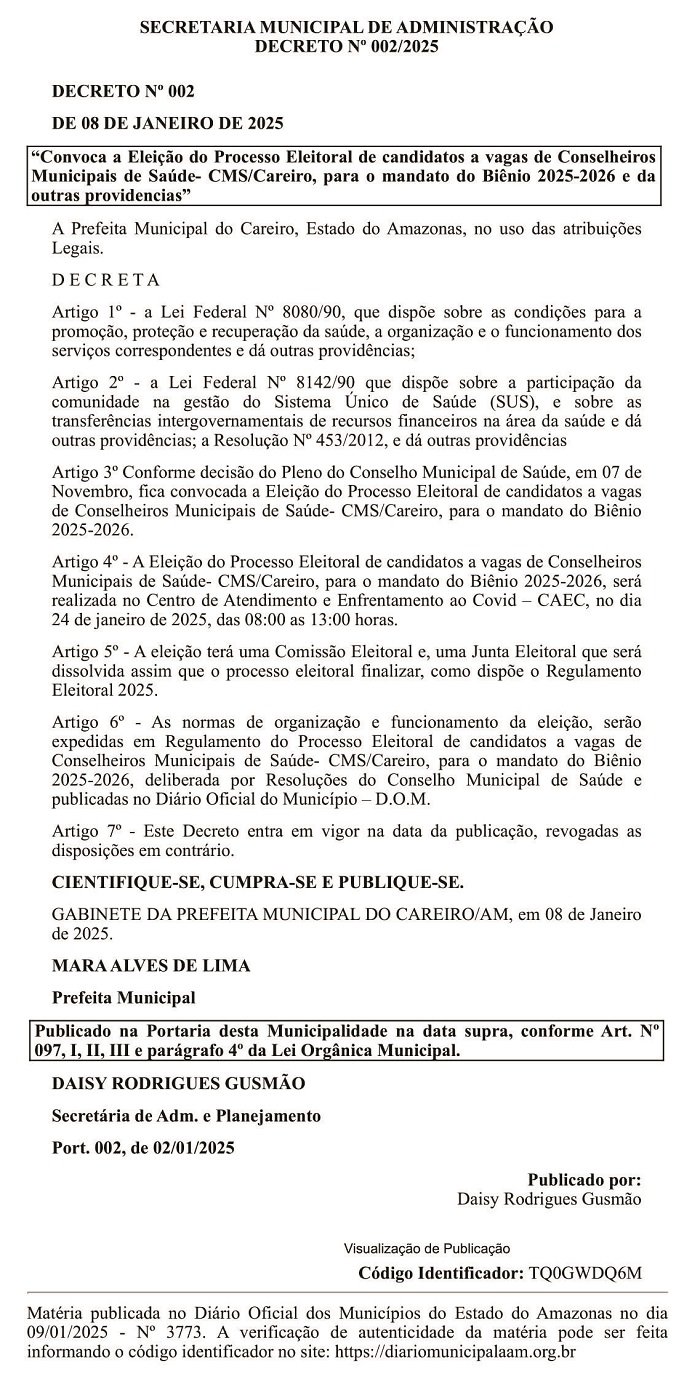 Careiro/AM – O Decreto Nº 002, de 08 de janeiro de 2025 e publicado no Diário Oficial dos Municípios do Amazonas nesta data (09/01/2025), convoca a realização do Processo Eleitoral para a eleição de candidatos às vagas de Conselheiros Municipais de Saúde (CMS) do município do Careiro, para o mandato referente ao biênio 2025-2026. A seguir, confira o texto completo do decreto:
