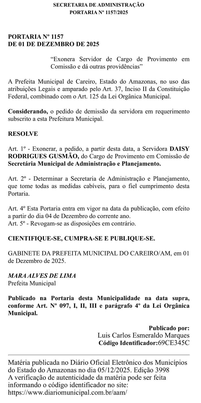 Careiro/AM — Após dias de especulação nas redes sociais sobre a saída da secretária municipal de Administração e Planejamento, Daisy Gusmão, a Prefeitura do Careiro publicou nesta sexta-feira (05) no Diário Oficial a exoneração da gestora. O documento confirma que a saída ocorreu “a pedido”. No entanto, vereadores pressionaram pela exoneração publicamente, incluindo a presidente da Câmara Municipal pediu a saída de Daisy Gusmão do cargo.