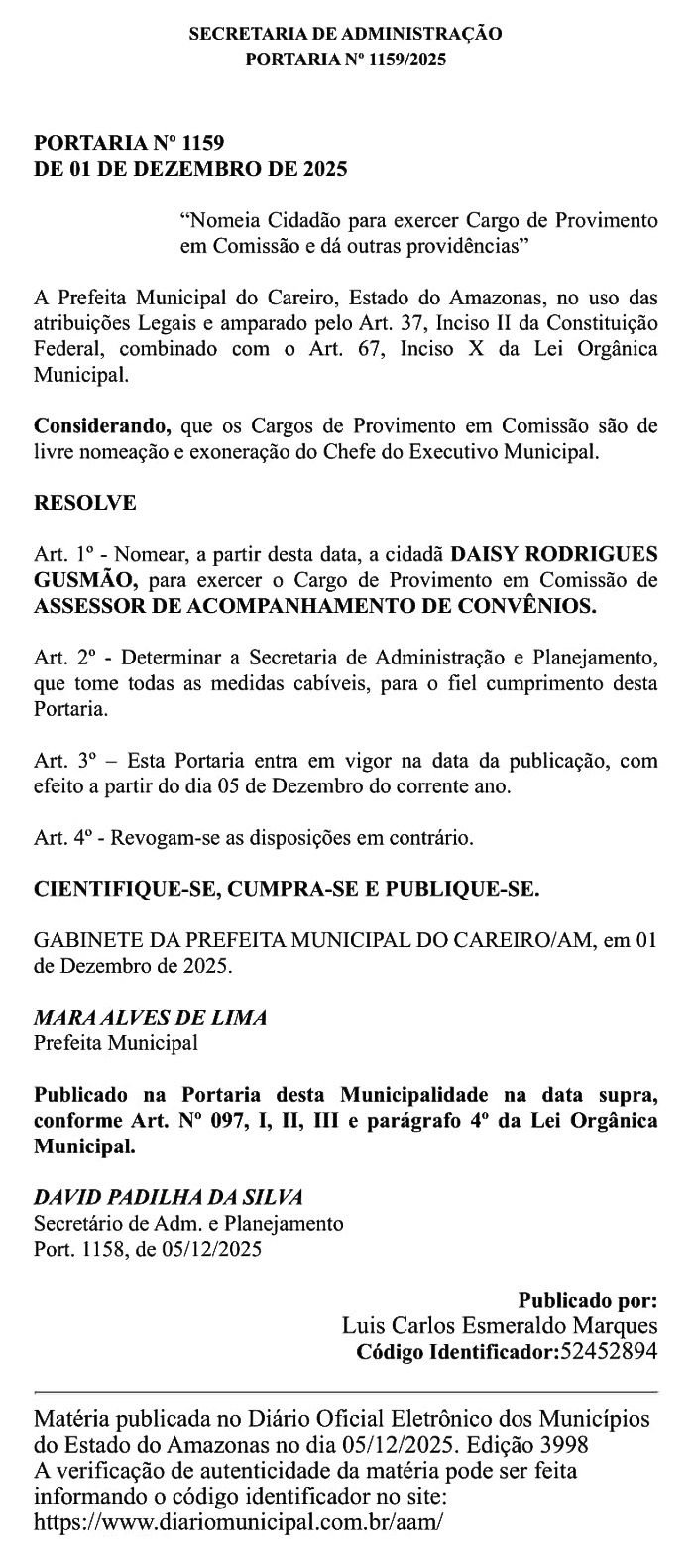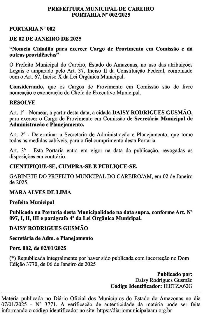 Novo secretário Administração e Planejamento — Para o lugar dela, foi nomeado David Padilha da Silva, que passa a responder pela Secretaria Municipal de Administração e Planejamento do Careiro.