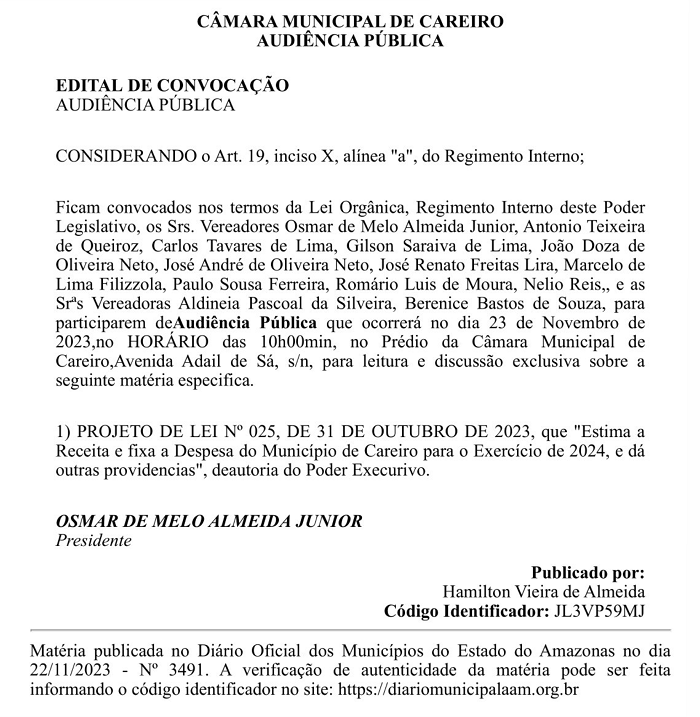 Careiro/AM: Foi publicado no Diário Oficial dos Municípios do Amazonas de hoje (22/11) Edital de Convocação de Audiência Pública conforme a seguir:
