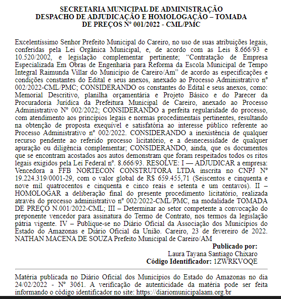 Fonte: Diário Oficial dos Municípios do Estado do Amazonas no dia 24/02/2022 – Nº 3061 – Código Identificador: 1ZWRKVOQE