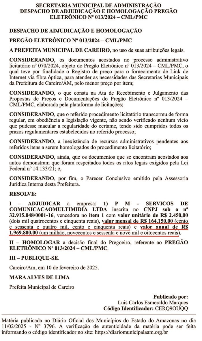 Careiro/AM: A empresa P M – Serviço de Comunicação Multimidia Ltda, inscrita no CNPJ sob o nº 32.915.048/0001-16, foi a vencedora do item 1 do Pregão Eletrônico Nº 013-2024/SRP – CML/PMC.