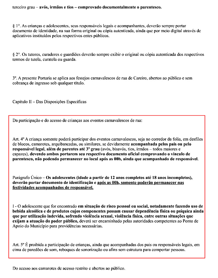 Art. 4º – A Criança só poderá participar de eventos carnavalescos, seja no corredor da folia, em desfiles de blocos, camarotes, arquibancadas, ou similares, se devidamente acompanhada pelos pais ou pelo responsável legal, além de parentes de 3º grau (avós, bisavós, tios irmãos – todos de maiores e capazes), devendo ambos portarem os seu respectivo oficial comprovando o vínculo de parentesco, não podendo permanecer no local após as 00h, ainda que acompanhado de responsáveis.