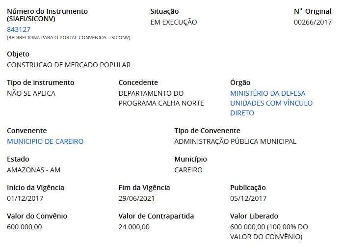 Careiro/AM – Inaugurado em março de 2022, portanto há mais de um ano o Mercado Municipal Francisco Esmerindo Rabelo construído no Município do Careiro no Amazonas custou aos cofres públicos o valor de R$ 600.000,00 (Seiscentos Mil Reais), resultado do Convênio N. 843127 recursos do Programa Calha Norte, devido a pouca utilização é um exemplo do que se chama de “Elefante Branco”.
