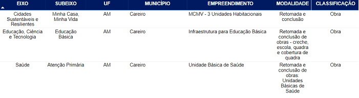 Obras do Nov PAC para o Careiro – Segundo informações no Município do Careiro no Amazonas constam: