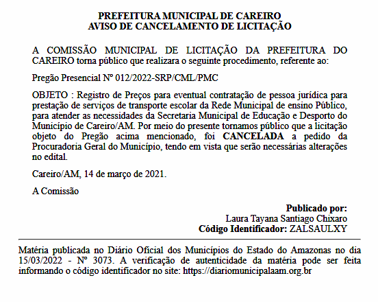 Careiro/AM – Conforme publicação no Diário Oficial dos Municípios do Estado do Amazonas de hoje (15) a Comissão Municipal de Licitação da Prefeitura do Careiro cancelou o Pregão Presencial Nº 012/2022-SRP/CML/PMC com o objetivo de contratação de pessoa jurídica para prestação de serviços de transporte escolar da Rede Municipal de ensino Público, conforme a seguir: