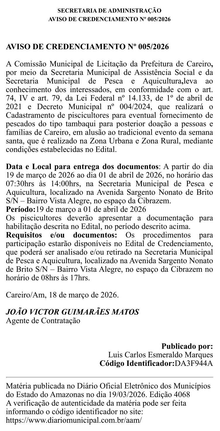 Careiro/AM – A Prefeitura Municipal de Careiro divulgou o Aviso de Credenciamento nº 005/2026, destinado a piscicultores interessados em fornecer tambaqui para doação a pessoas e famílias do município durante a Semana Santa.