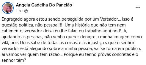 Na publicação, a Sra. Angêla não revela o nome do parlamentar nem detalha os motivos da suposta perseguição. A postagem está gerando repercussão entre moradores e seguidores, levantando questionamentos sobre o caso — entre eles, desde quando seria atribuição de um vereador “perseguir” cidadãos do município.