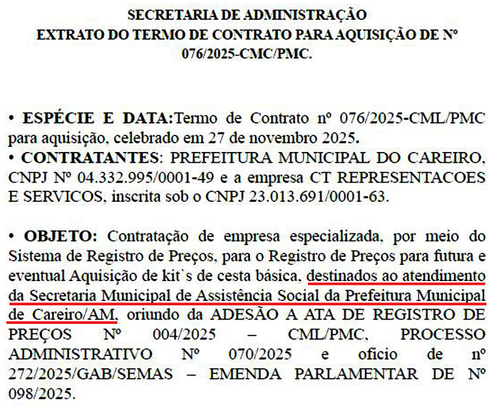 O que diz os Contratos?: “Aquisição de kit`s de cesta básica, destinados ao atendimento da Secretaria Municipal de Assistência Social da Prefeitura Municipal do Careiro/AM.” Conforme a seguir: