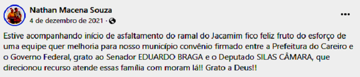 Comentário do Prefeito do Careiro postado na Rede Social: