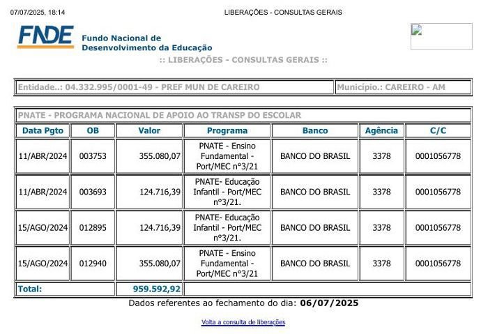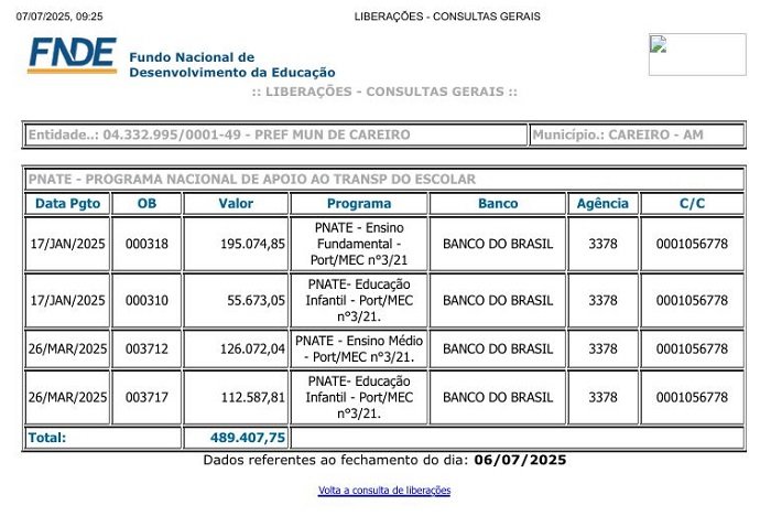Careiro/AM – O município do Careiro, no Amazonas, recebeu um total de R$ 1.449.000,00 em recursos financeiros do Programa Nacional de Apoio ao Transporte Escolar (PNATE). Os valores foram liberados ao longo do exercício de 2024 e nos meses de janeiro a março de 2025.