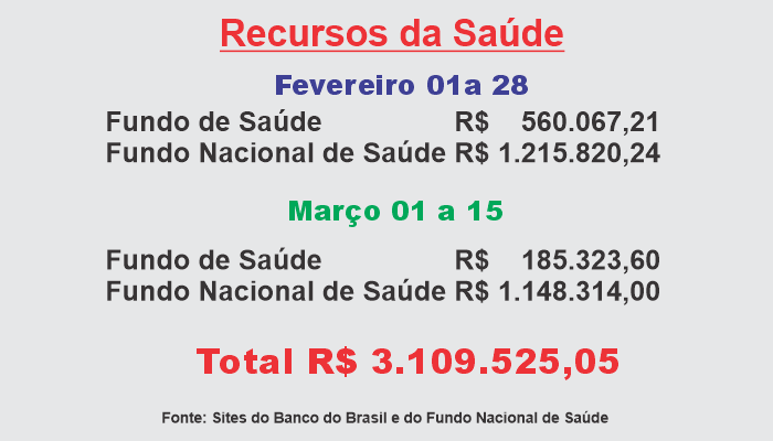 Careiro/AM – Conforme pesquisa realizada hoje (15) nos sites do Banco do Brasil e do Fundo Nacional de Saúde o município do Careiro no Amazonas recebeu no período 01 de fevereiro a 15 de março recursos da saúde no valor de R$ 3.109.525,05 (Três milhões, cento e nove mil, quinhentos e vinte e cinco reais e cinco centavos), conforme a seguir: