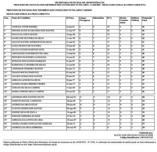 Careiro/AM – Confira o resultado geral da prova objetiva para o escolha dos membros dos Conselheiros Tutelares Careiro, conforme publicação no Diário Oficial dos Municípios do Estado do Amazonas de hoje (16/8), conforme a seguir: