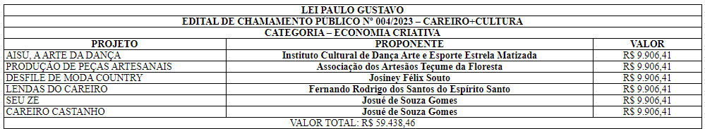Careiro/AM – Hoje (09/02/24) foi publicado no Diário Oficial a decisão final da Comissão de Avaliação dos Projetos referente a CHAMADA PUBLICA N° 004/2023 – SEMCULT/PMC, veja a seguir os projetos contemplados com recursos da LEI COMPLEMENTAR 195/2022 (LEI PAULO GUSTAVO) – ECONOMIA CRIATIVA.