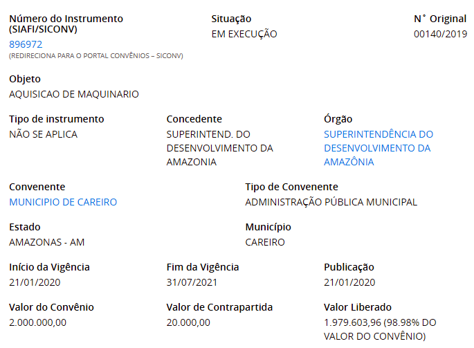 Careiro/AM – A prefeitura municipal do Careiro recebeu no ultimo dia 05 de junho o valor de R$ 1.979.603,96 (Hum milhão, novecentos e setenta e nove mil, seiscentos e três reais e noventa e seis centavos) para comprar maquinas para a recuperação de vicinais referente ao convênio 00140/2019 no valor global de R$ 2.000.000,00 (Dois milhões de reais) conforme convênio a baixo: