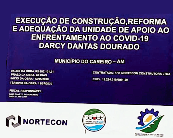Careiro/AM – Demorou mais diante da cobrança nas redes sociais finalmente foi instalada a placa com as informações da execução de construção, reforma e adequação da unidade de apoio ao Covid-19 “Darcy Dantas Dourado”.