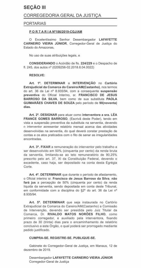 Brasil – Por determinação do Conselho Nacional de Justiça (CNJ) com base na Resolução Nº 80 de 09/06/2009 foi decretado intervenção em centenas de Cartórios Extrajudicial em todo o Brasil, entre eles está o Cartório Extrajudicial da Comarca do Careiro-AM conforme publicado no Diário Eletrônico do Tribunal de Justiça do Amazonas publicado no último dia (16), pelo Corregedor-Geral de Justiça do Estado do Amazonas Desembargador Lafayette Carneiro Vieira Júnior, que reproduzimos a seguir: