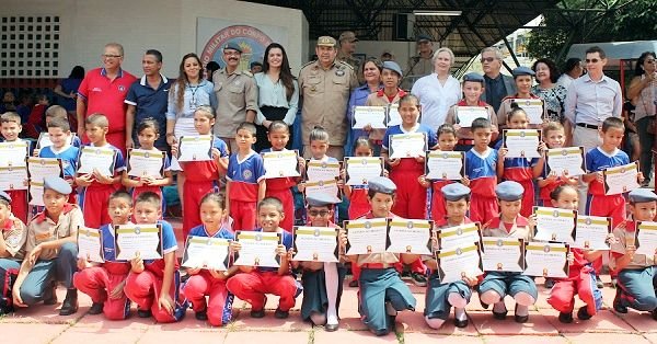 As autoridades presentes com os alunos que receberam Diploma de Honra ao Mérito por tirarem notas igual ou superior a 8 (Oito). Foto: Edson Brito/Portal do Careiro