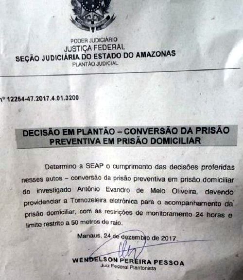 O juiz plantonista da Justiça Federal Wendelson Pereira Pessoa converteu a prisão preventiva do ex-secretário Evandro Melo, irmão do governador cassado José Melo, em prisão domiciliar com monitoramento por meio de tornozeleira eletrônica. O alvará de soltura chegou ao Centro de Detenção Provisória de Manaus 2 (CDPM 2), no km 8 da BR-174, por volta de meio-dia, de acordo com informações da Justiça Federal.