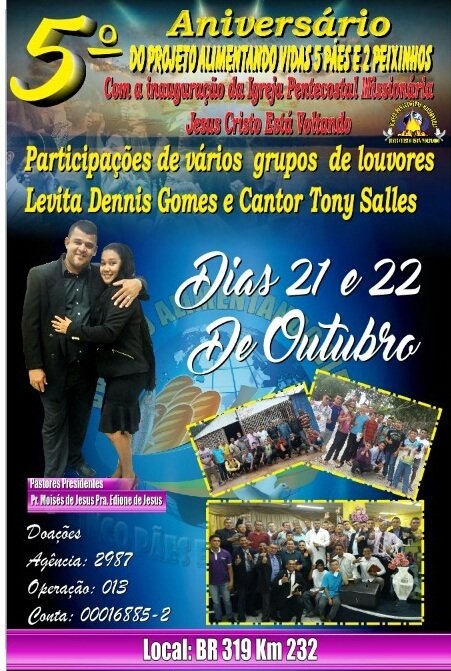 O Projeto 5 Pães e 2 Peixinhos é um projeto do amor de Deus por vidas salvas que nasceu no coração do Pr. Moisés de Jesus da Igreja Pentecostal Missionária Jesus Cristo Está Voltando é um projeto de recuperação de dependentes químicos, que na grande maioria são abandonados pela família e excluídos da sociedade, essas pessoas no Projeto 5 Pães e 2 Peixinhos são preparadas para voltar novamente ao seio da família e da sociedade.