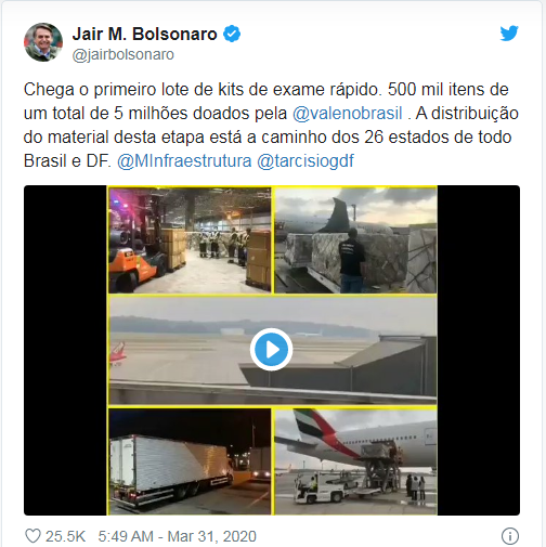 Em publicação no Twitter, o presidente Jair Bolsonaro destacou o trabalho da equipe. “Chega o primeiro lote de kits de exame rápido. Quinhentos mil itens de um total de 5 milhões doados pela Vale. A distribuição do material desta etapa está a caminho dos 26 estados de todo Brasil e DF”, escreveu.
