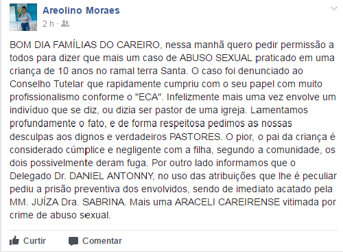 Careiro Castanho (110 Km de Manaus). A informação foi publicada hoje 26/05 no Facebook do Conselheiro Tutelar Areolino Moraes confira a postagem a baixo: