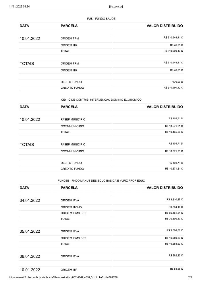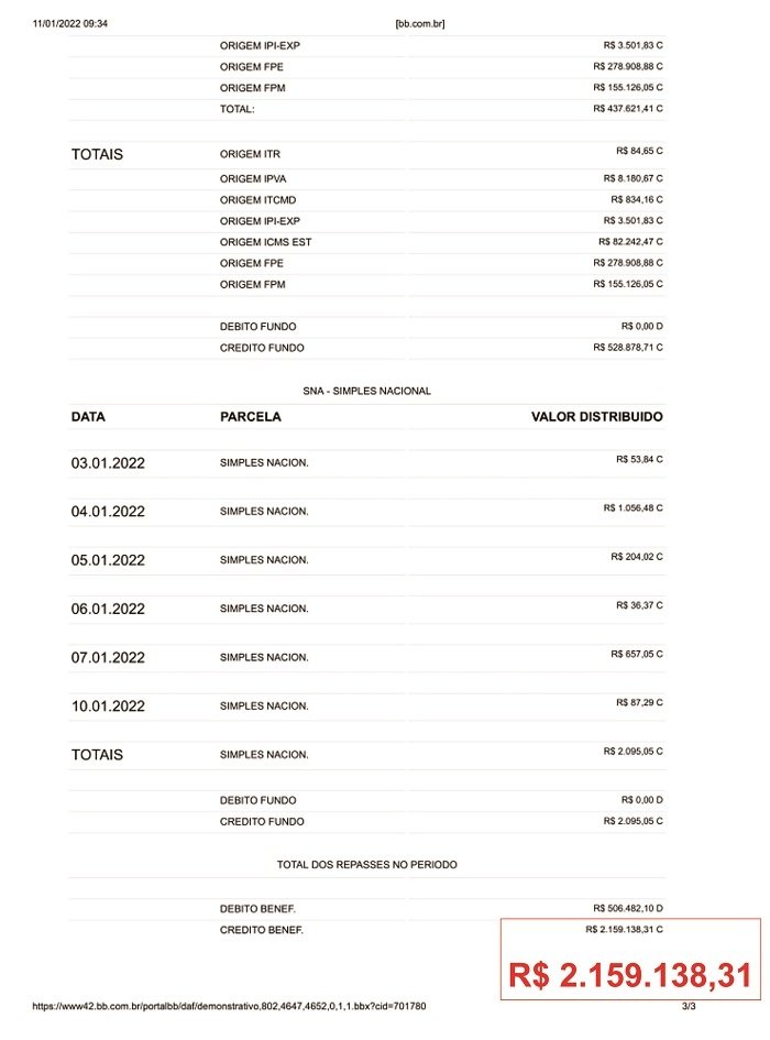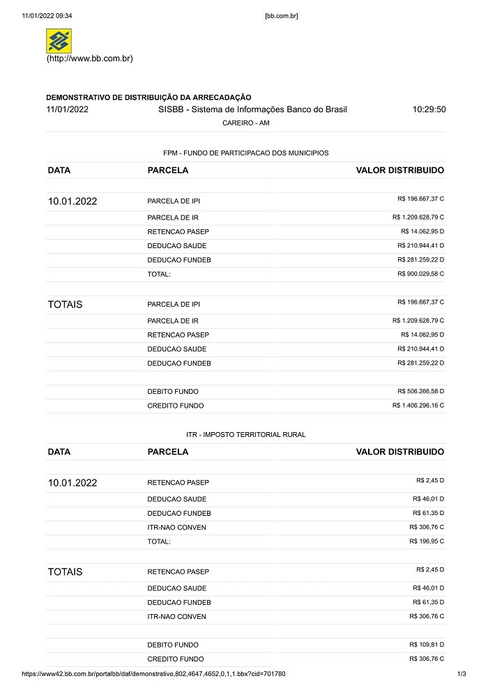 Careiro/AM – Conforme publicação no site do Banco do Brasil o município do Careiro no Amazonas recebeu de recursos constitucionais do Governo Federal o valor bruto de R$ 2.159.138,31 (Dois milhões, cento e cinquenta e nove mil, cento e trinta e oito reais e trinta e um centavos). Veja a seguir: