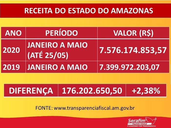 Manaus/AM – De 1º de janeiro a 25 de maio, a arrecadação do Estado do Amazonas cresceu R$ 176,2 milhões quando comparado até maio 2019. Os dados, disponíveis no Portal da Transparência Fiscal da Sefaz (Secretaria de Estado da Fazenda), foram apresentados pelo deputado Serafim Corrêa (PSB) durante a sessão virtual da ALE-AM (Assembleia Legislativa do Estado) desta terça-feira, 26.