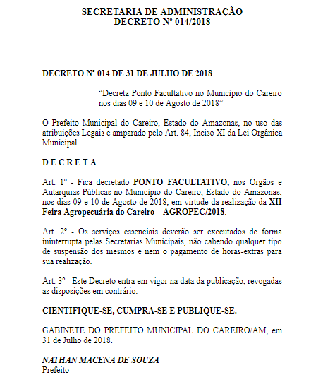 A seguir publicamos o decreto que torna ponto facultativo nos dias 09 e 10 de agosta data da realização da XII Feira Agropecuaria do Careiro – Agropec/2018.