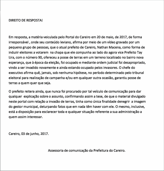 Nota: O Portal do Careiro registra publicamente que o direito de resposta do autor do processo contra o Portal do Careiro ainda não havia sido publicado no Portal do Careiro, conforme determinação da justiça, porque somente hoje 03.06.2017 ás 10h e 43 minutos a resposta foi enviada ao Portal do Careiro através do e-mail portaldocareiro@gmail.com.