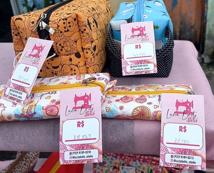 Artesanato: Com Lucia Brito Ateliê e Costuritas da Fê, nécessaire, nécessaire box, bolsas, mochilas e outros.