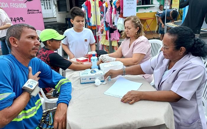 Aferição de pressão arterial e glicemia, são realizados pelas senhoras Iara Cunha e Ianara Figueiredo