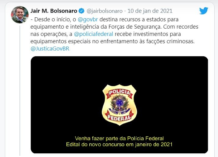Brasil – Em publicação no Twitter, na manhã deste domingo (10), o presidente Jair Bolsonaro informou que o edital para o concurso da Polícia Federal deve ser publicado ainda em jane.