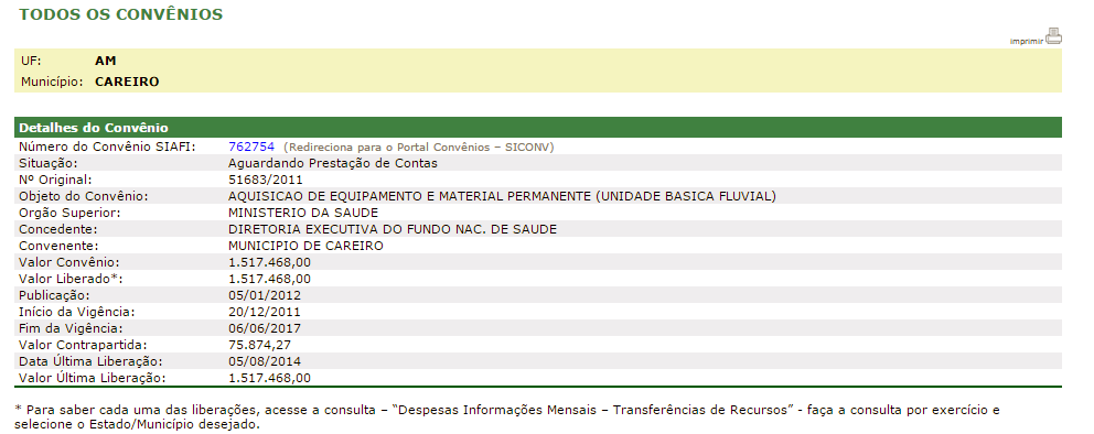 1 – Em em 2014 a Prefeitura Municipal do Careiro recebeu o valor de R$ 1.517.468,00 através de um convênio para a construção de uma UBS-Fluvial;