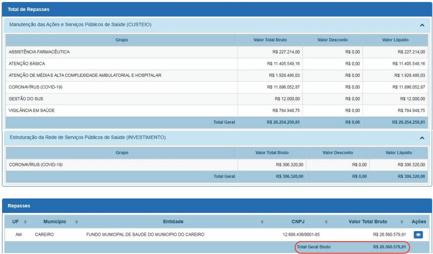 Careiro/AM – Conforme pesquisa realizada hoje (01/01) o município do Careiro recebeu o valor de R$ 26.560.579,81 (Vinte e seis milhões, quinhentos e sessenta mil reais) para a área de saúde, conforme informação do site do Fundo Nacional de Saúde (FNS) a seguir: