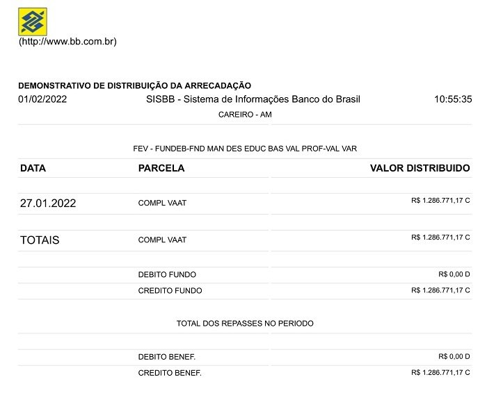 Careiro/AM – Somente no mês de janeiro o município do Careiro recebeu do Governo Federal, recursos do FUNDEB – Fundo de Manutenção e Desenvolvimento da Educação Básica -o valor de R$ 5.847.828,83 (Cinco milhões, oitocentos e quarenta e sete mil, oitocentos e vinte e oito reais e oitenta e três centavos) conforme a seguir: