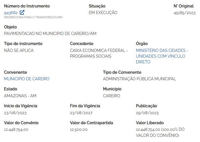 | Convênio 943682 – Pavimentação | R$ 4.979.501,60 |